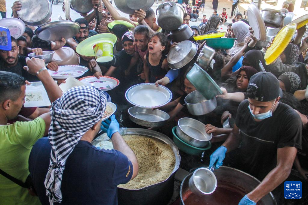 2024年8月29日,在加沙地带北部杰巴利耶难民营,当地民众领取救济食物。