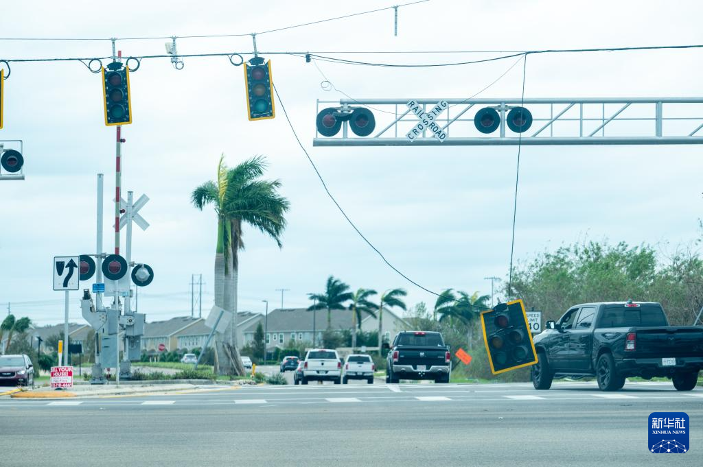 10月10日,在美国佛罗里达州坦帕,飓风“米尔顿”过境后,被损坏的交通信号灯悬在半空。