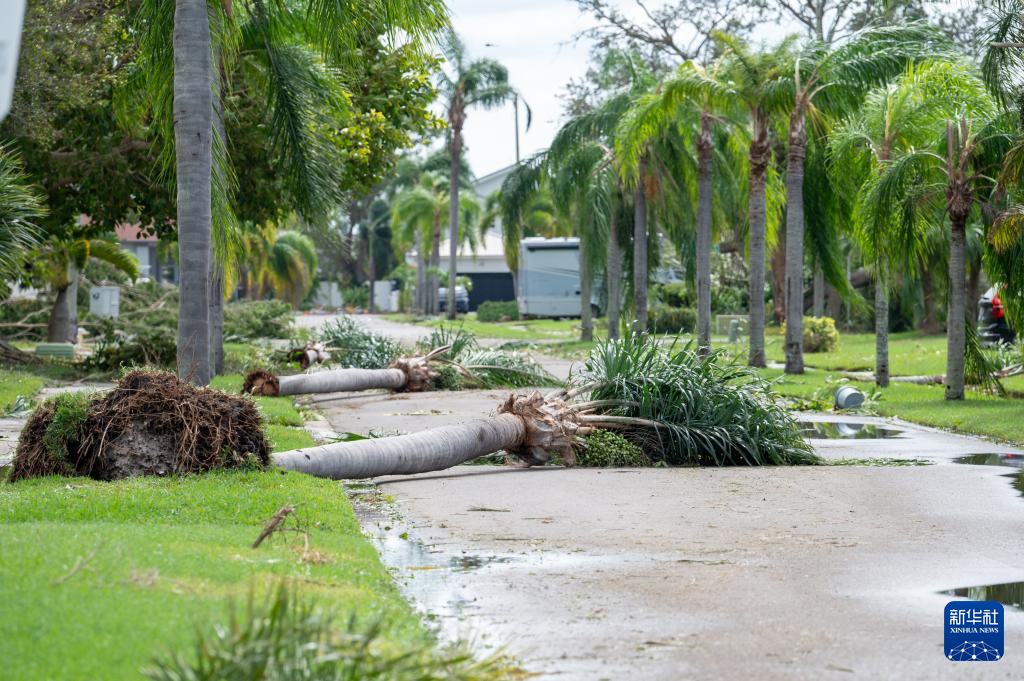 10月10日,在美国佛罗里达州坦帕,飓风“米尔顿”过境后,树木被连根拔起倒在路上。