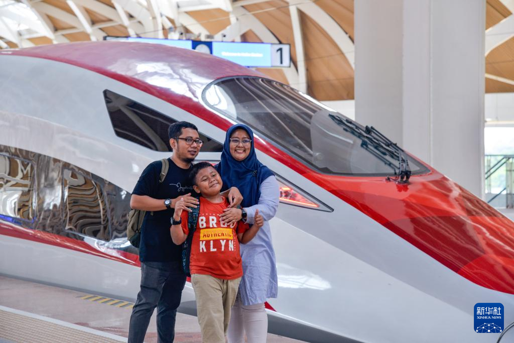 4月17日,在印度尼西亚雅加达哈利姆站站台,乘客和雅万高铁高速动车组列车合影。