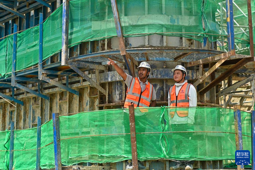 10月11日,在马来西亚雪兰莪州,中交马东铁项目现场工程师阿兹里尔·哈基姆(右)与马东铁鹅唛车站施工负责人陈威柏(左)在施工现场视察工程。