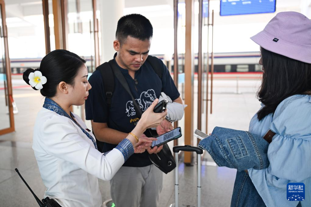10月12日,在老挝万象中老铁路万象站,工作人员检验乘客车票。