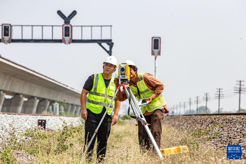 5月1日,在泰国大城府,中泰高铁项目工作人员在施工现场勘查。