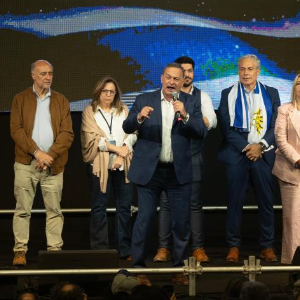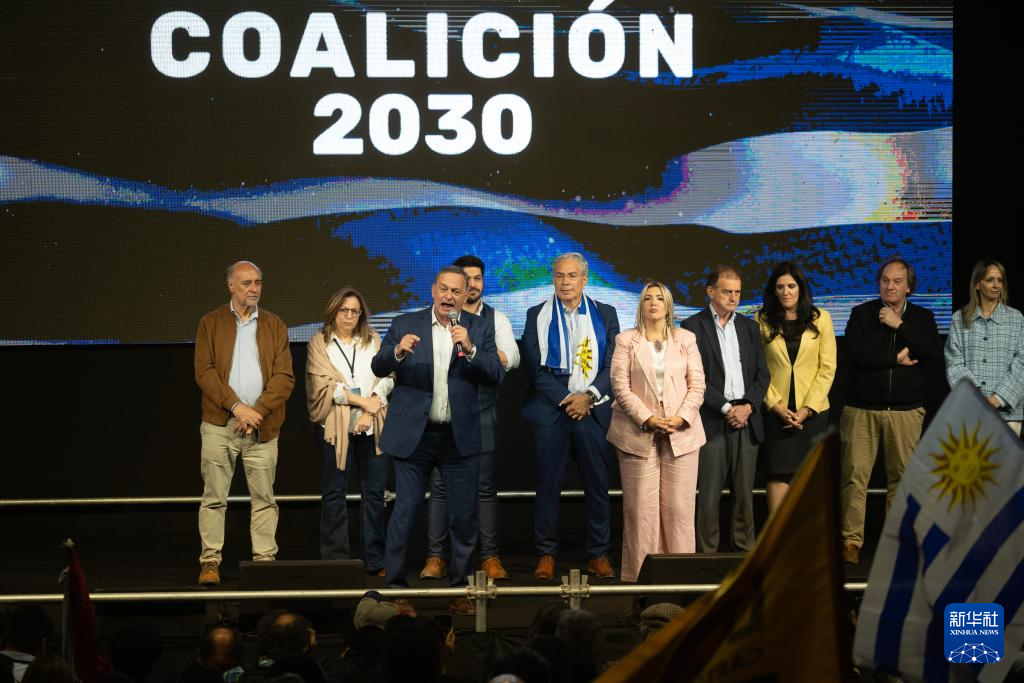 10月27日,在乌拉圭首都蒙得维的亚,执政党民族党(白党)候选人阿尔瓦罗·德尔加多(左三)在竞选活动上讲话。