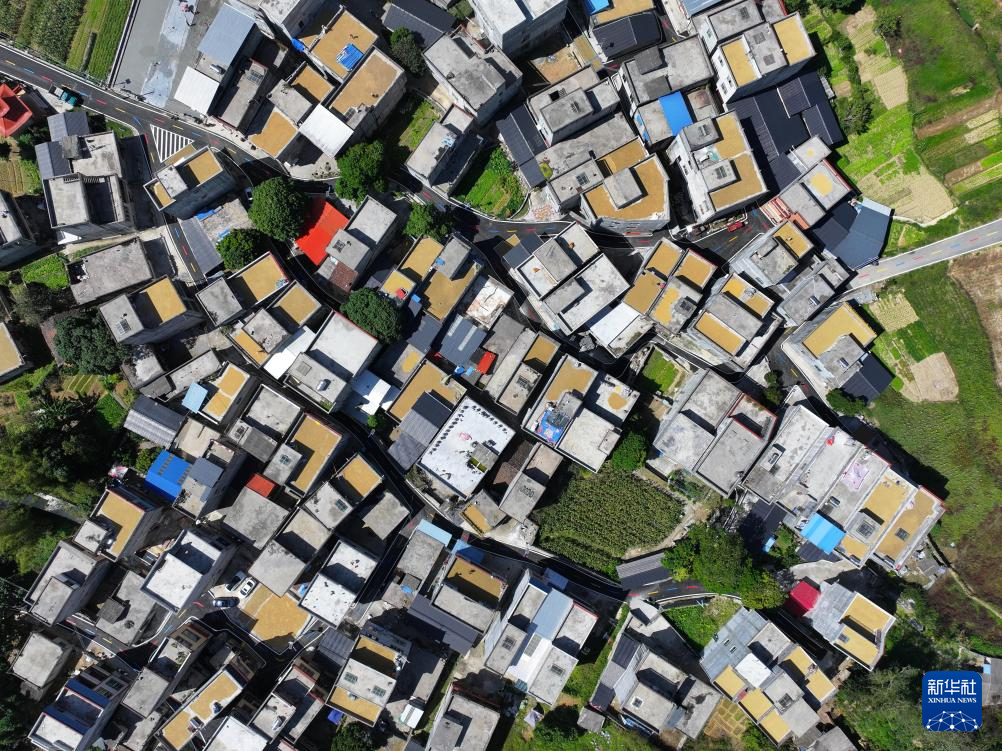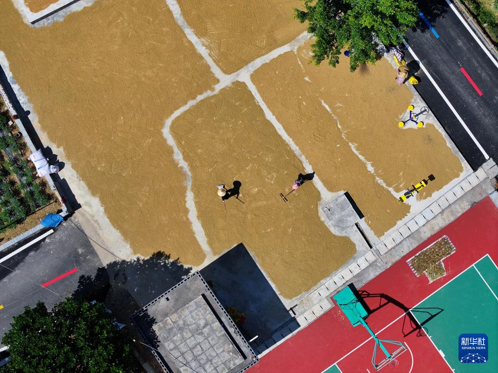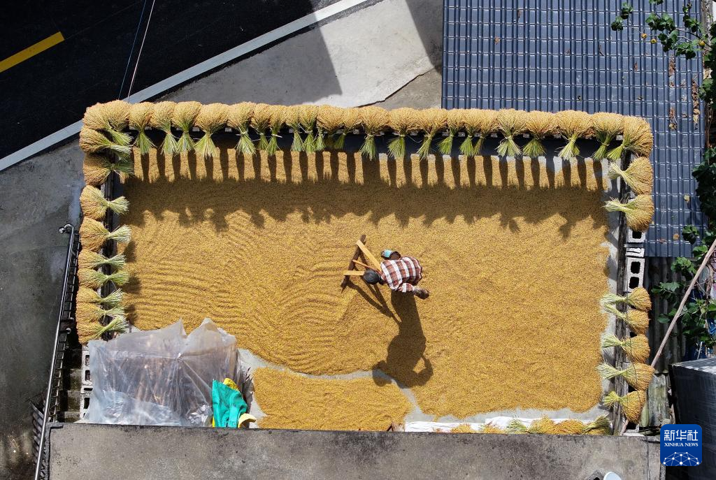 金秋时节,广西百色市德保县城关镇那造村群众抢抓秋高气爽的有利时机,在房顶屋旁晾晒稻谷和玉米,金黄色的粮食点缀在美丽的乡间,形成一道独特的景象。