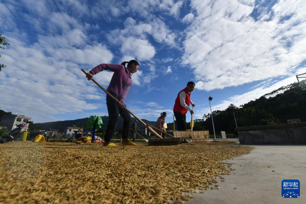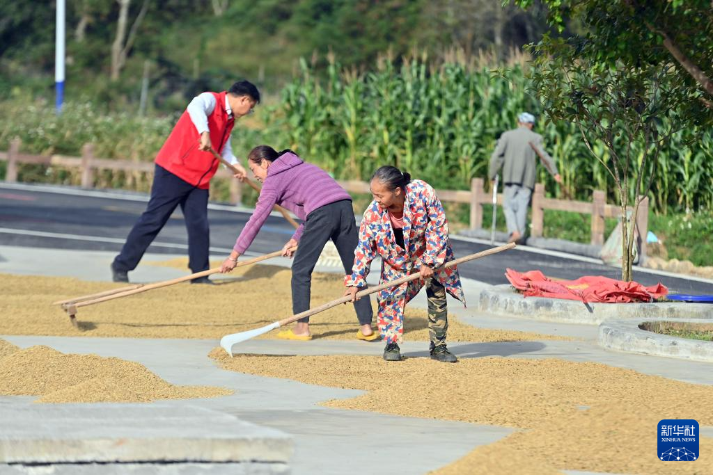 10月29日,在广西德保县城关镇那造村,村民在晾晒稻谷。