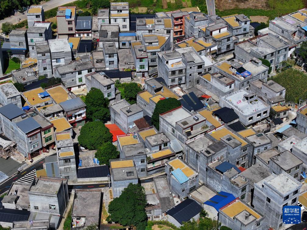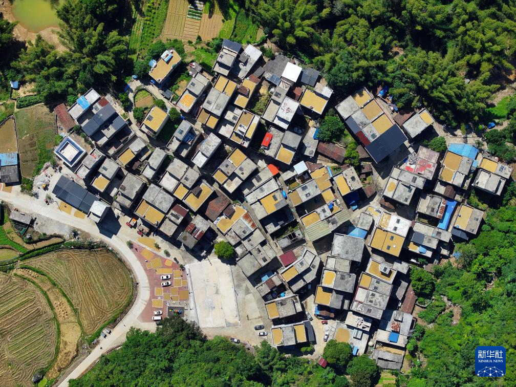 10月29日,在广西德保县城关镇那造村,村民在屋顶晾晒稻谷(无人机照片)。