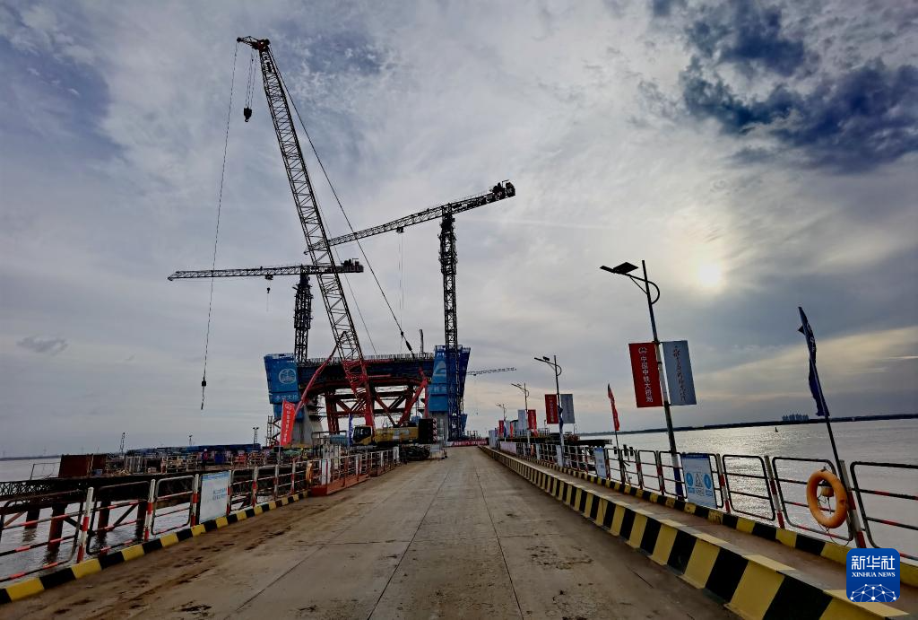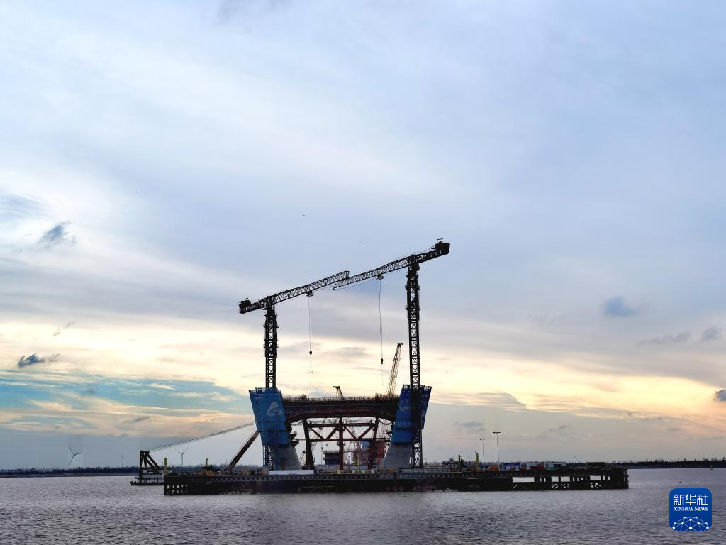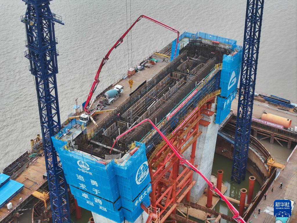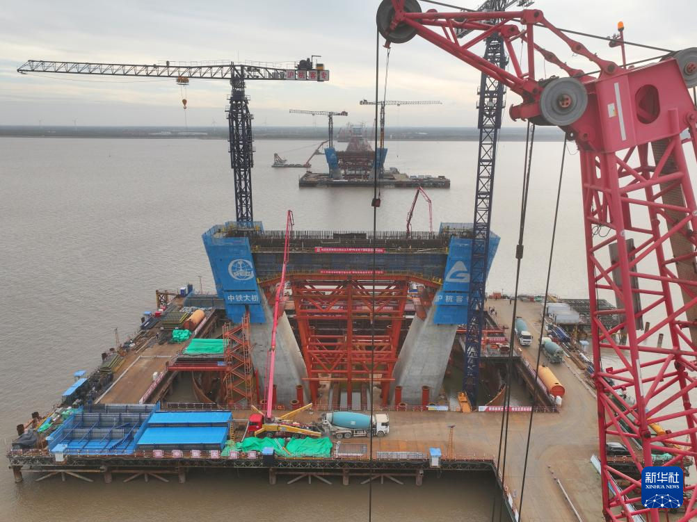 11月9日拍摄的崇启公铁长江大桥4号主塔下横梁及其塔柱连接段首层浇筑施工现场(无人机照片)。
