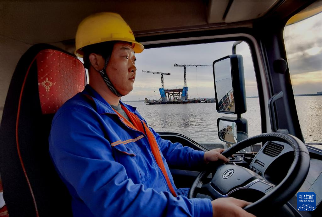 11月9日,在崇启公铁长江大桥建设现场,司机运输混凝土。