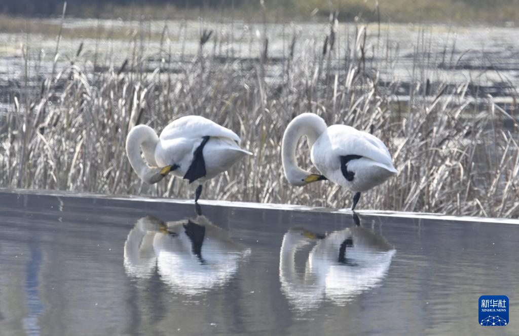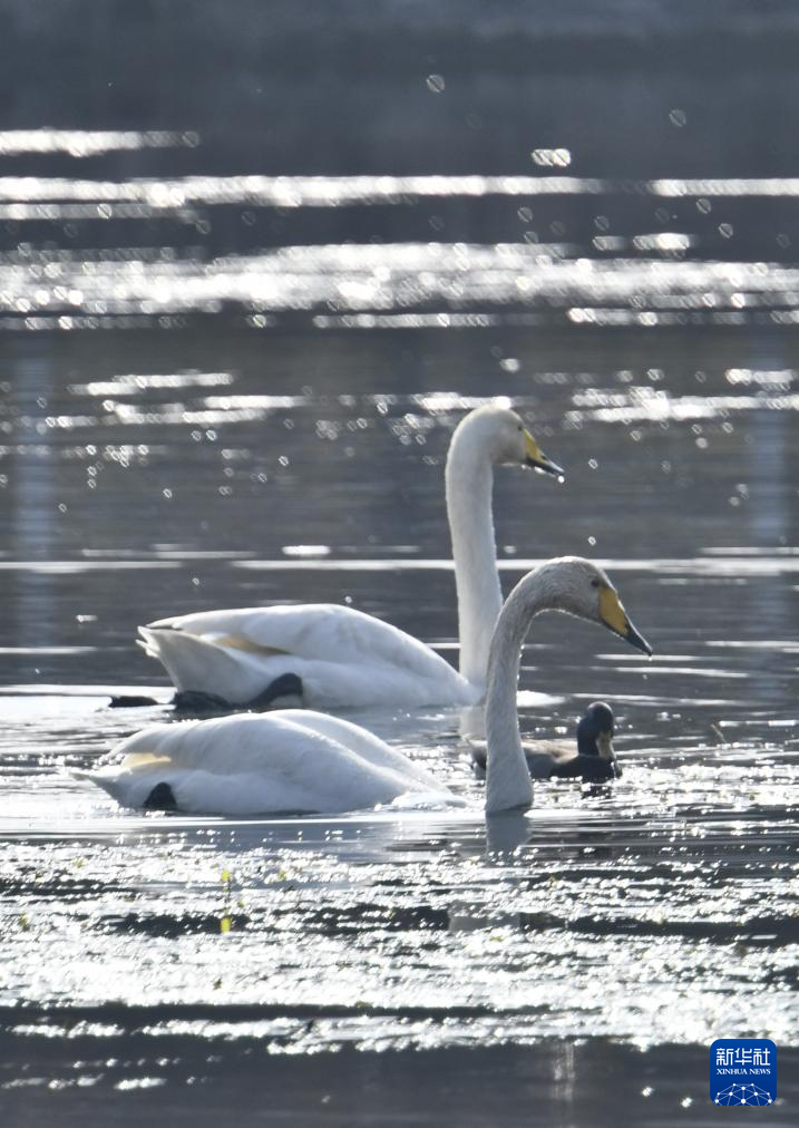 11月15日,天鹅在密云水库上游的清水河中栖息觅食。