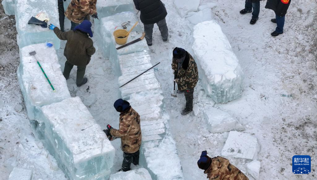 11月27日,工人在第二十六届哈尔滨冰雪大世界冰建施工现场作业(无人机照片)。