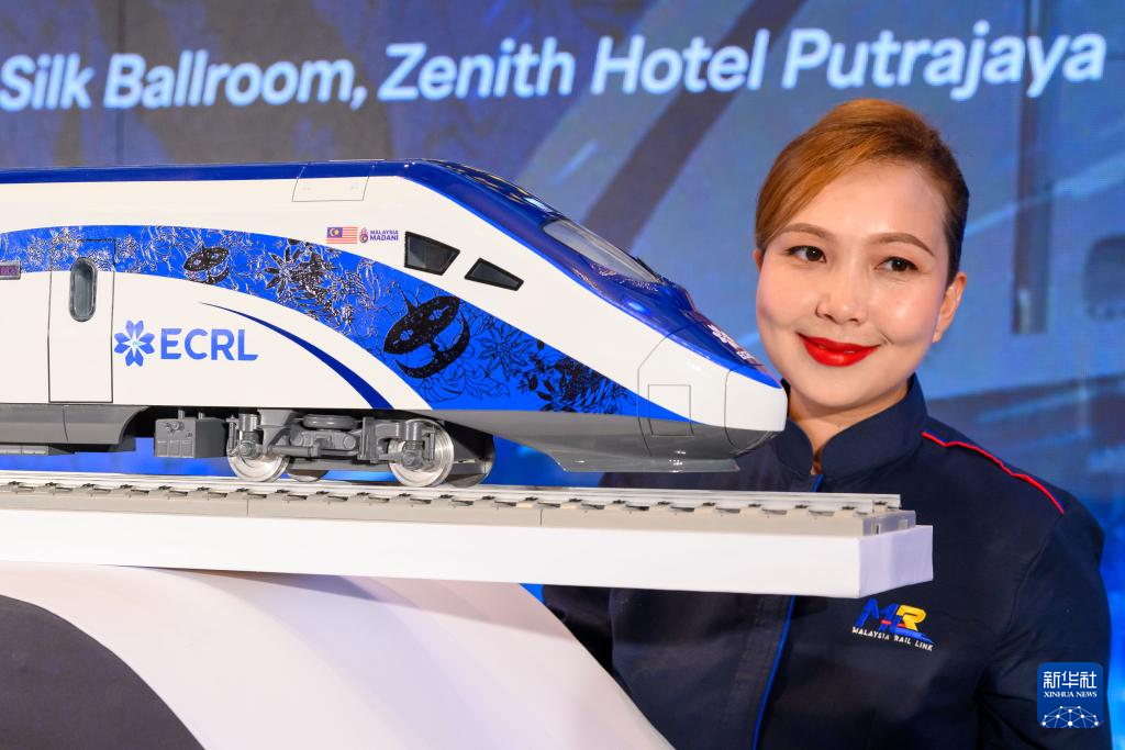 12月18日,在马来西亚普特拉贾亚,嘉宾在新的动车组模型和全新官方标志前合影。