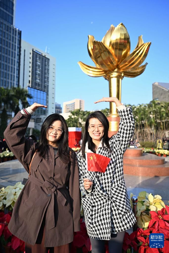 12月20日,澳门特别行政区政府隆重举行升旗仪式,庆祝澳门回归祖国25周年。这是人们在观看升旗仪式后留影。