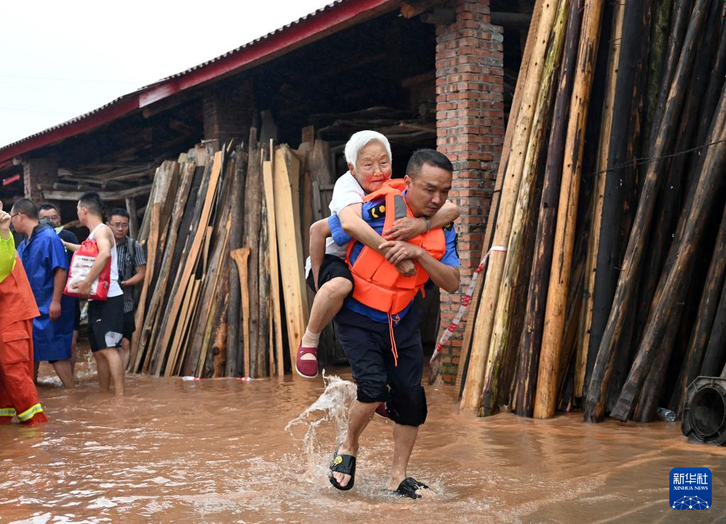 7月14日,在四川省内江市东兴区田家镇,暴雨天气发生后,救援人员转移被困群众。