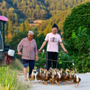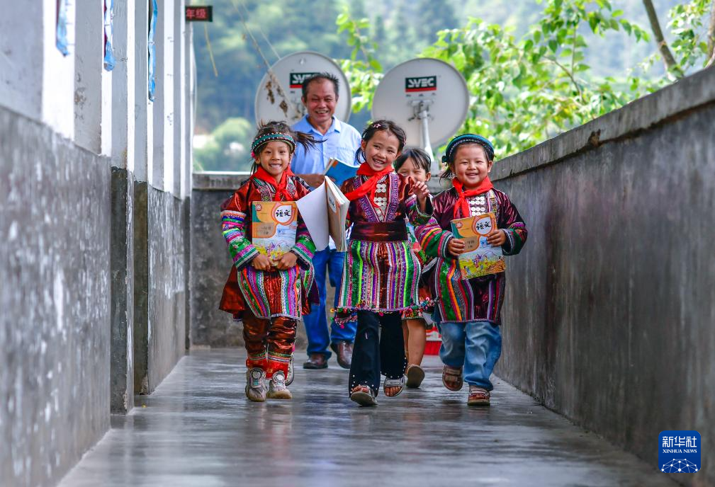 9月6日,在贵州省黔东南苗族侗族自治州从江县西山镇的中寨教学点,59岁的老师孟荣达(后)与学生们在下课后走出教室。
