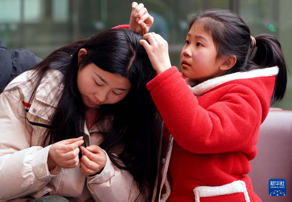 1月26日,在郑州东站候车大厅,一名小朋友在候车时帮妈妈拔白头发。