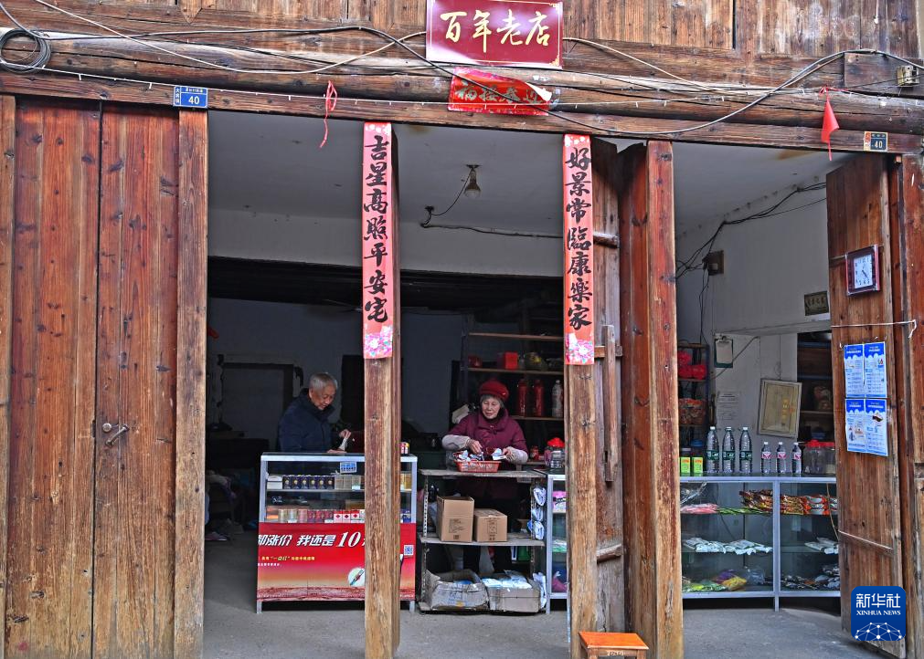 龙妙屯80岁的村民李茂生(左)在自家商店整理货品(12月17日摄)。