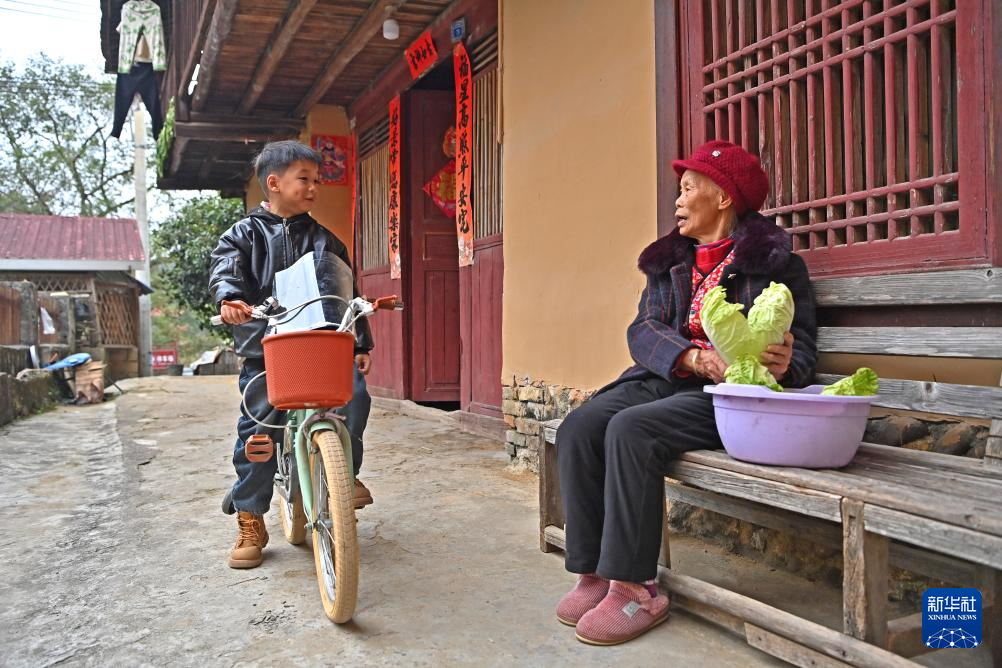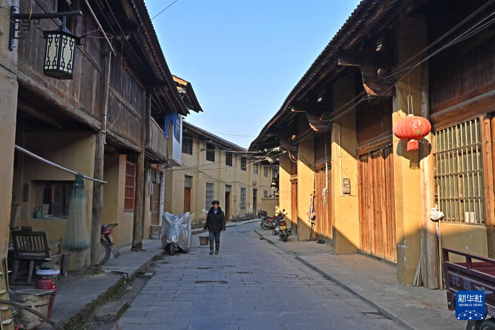 村民行走在广西柳州市融安县大将镇龙妙村龙妙屯老街上(12月18日摄)。