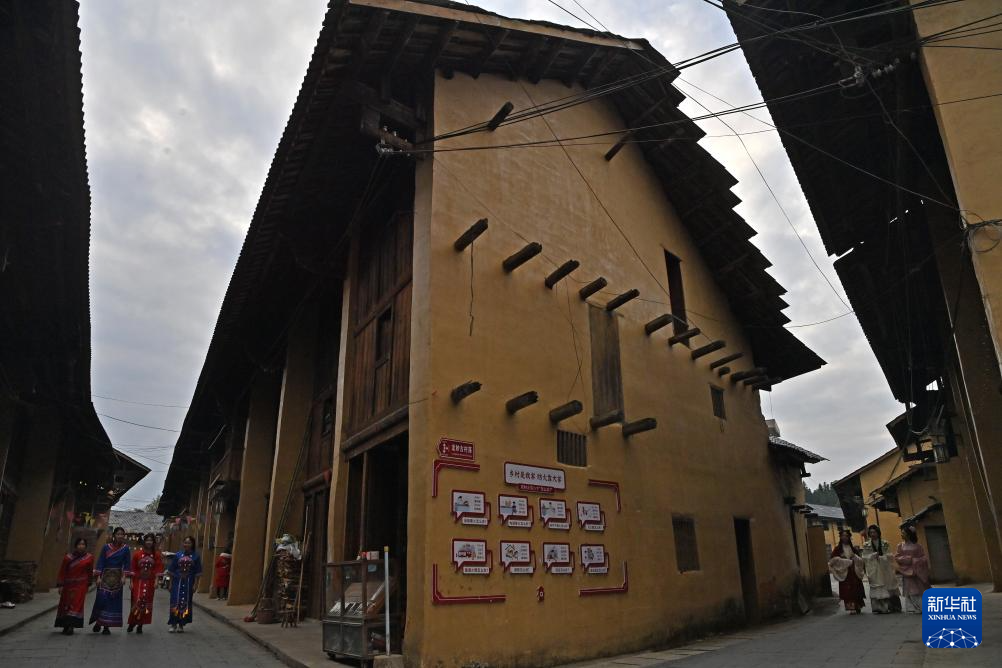 在广西柳州市融安县大将镇龙妙村,人们行走在百年老街上(3月25日摄)。