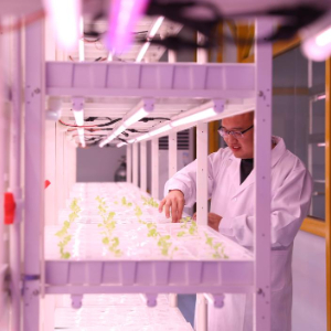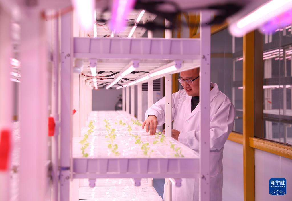 12月25日,在位于河南新乡的中原农谷植物工厂,科研人员查看培育的生菜苗。