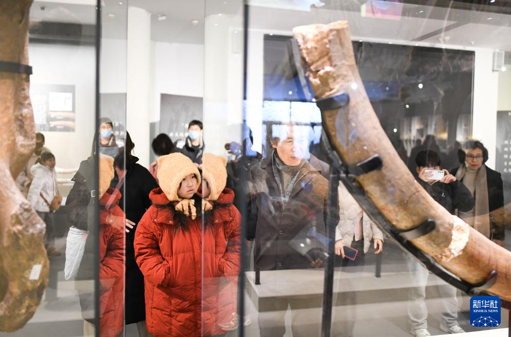 12月28日,人们在山东省潍坊市博物馆观看潍坊象门齿化石。