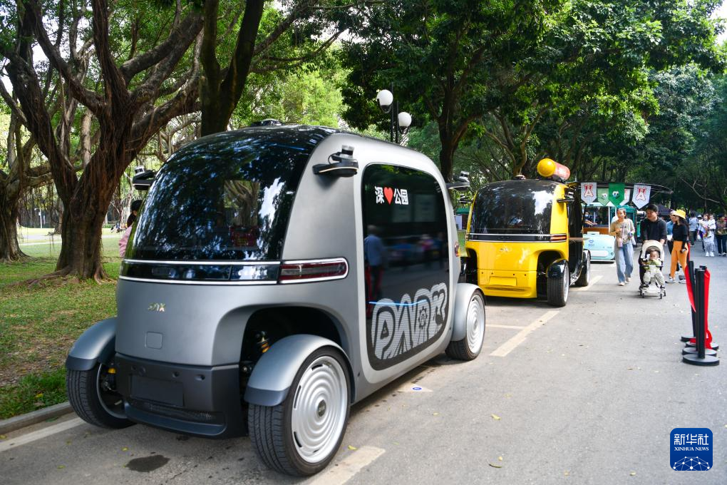 这是2024年11月11日在深圳莲花山公园拍摄的无人驾驶观光车、零售车。