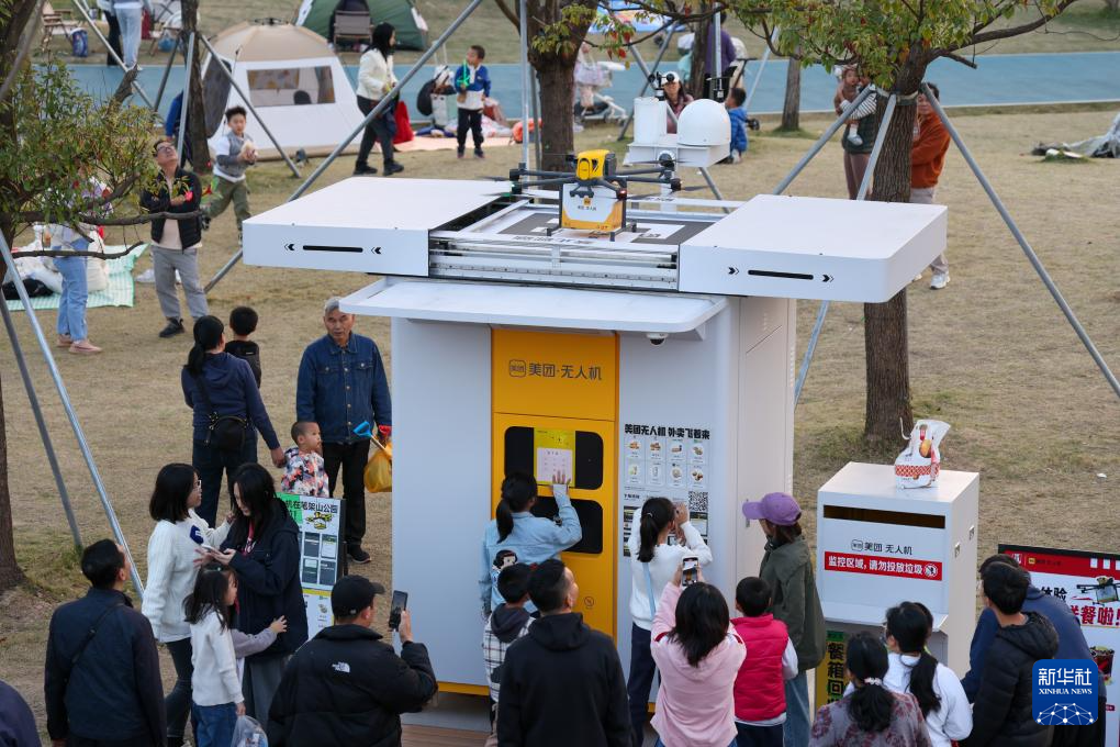 2024年12月28日,人们在深圳笔架山公园里体验无人机送外卖。