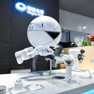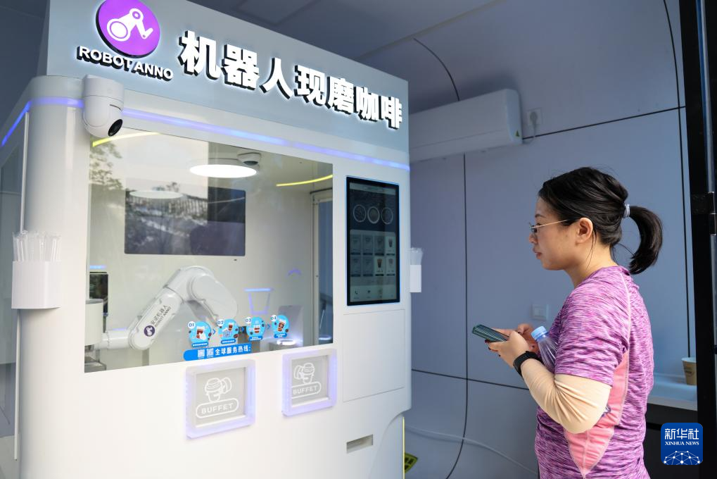 2024年11月27日,在深圳光明区的明湖公园里,机器人在制作咖啡。