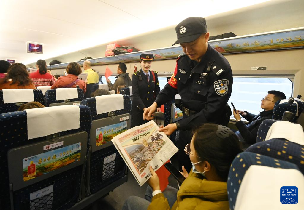 2024年12月30日,在广西玉林开往南宁的列车上,工作人员为旅客送上当天的报纸。