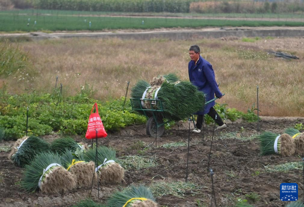 2024年10月27日清晨,觉山村村民在田间收获香葱。