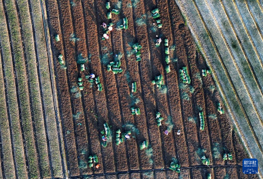 2024年11月3日,觉山村村民在田间采收香葱(无人机照片)。