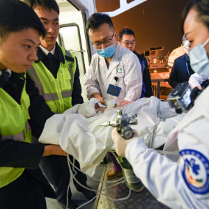 1月10日,在成都双流国际机场,机场工作人员和医护人员将伤员从机舱转运至升降车上。