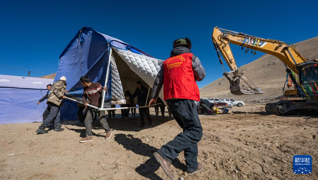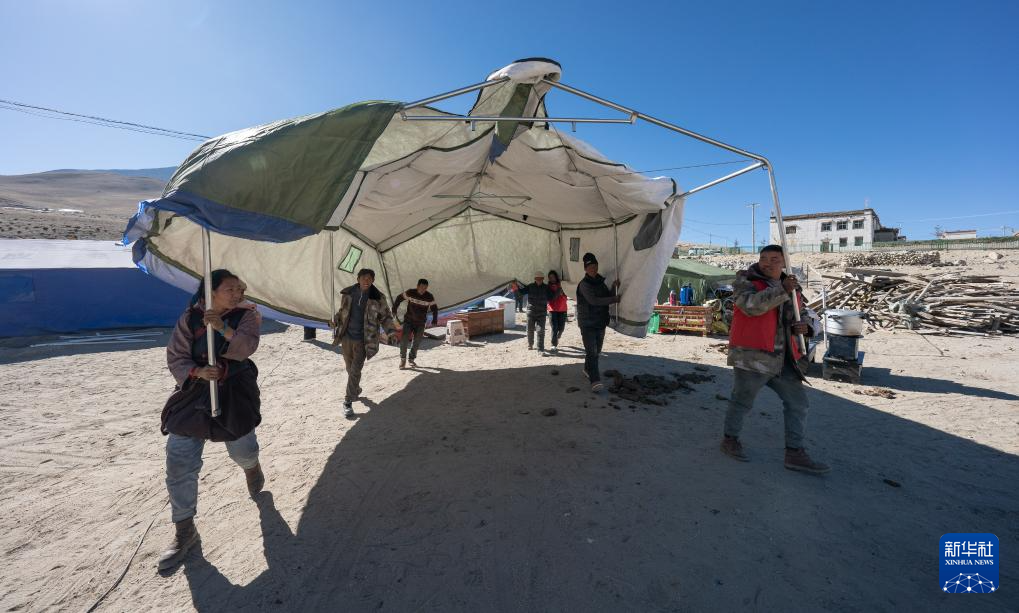 在定结县郭加乡乃村集中安置点,村民和志愿者在搬运帐篷(1月11日摄)。