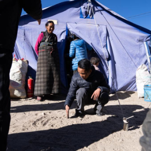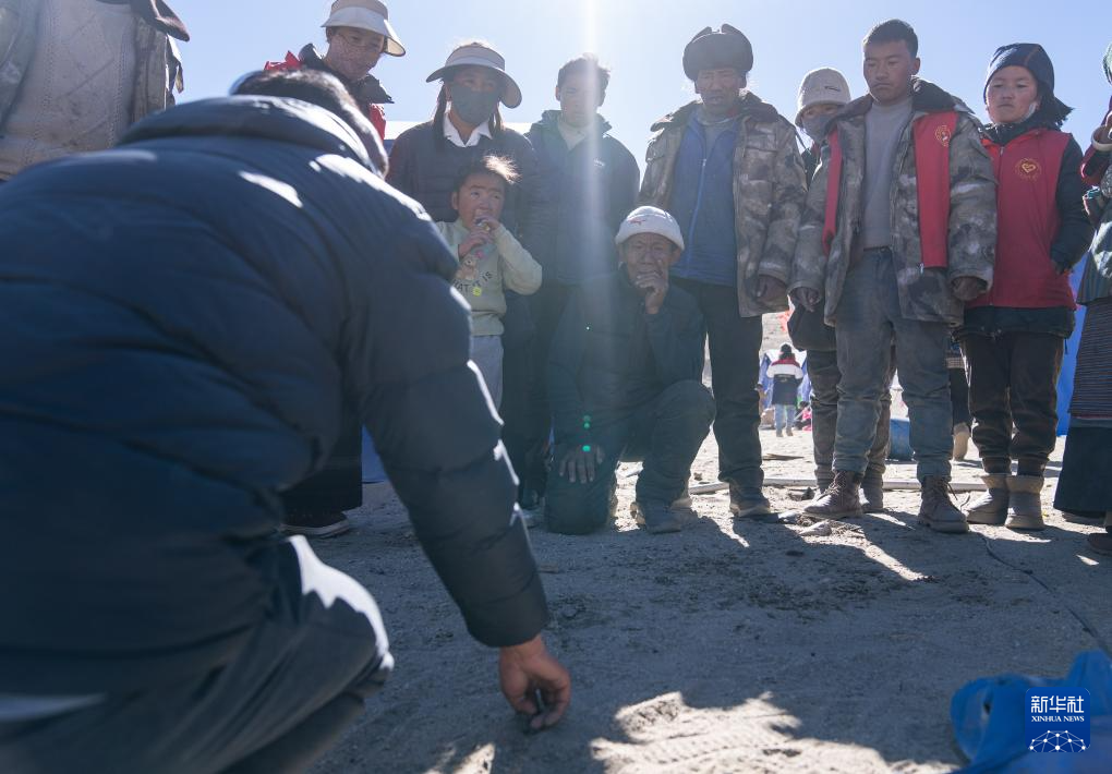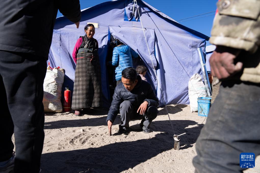 11日早晨,在郭加乡乃村集中安置点,10多名村民围在帐篷前一起讨论。记者走近一看,一个皮肤黝黑的小伙子,眉头紧锁,蹲坐在人群中,用手指在沙地上画图。他是郭加乡乡长米玛次仁。
