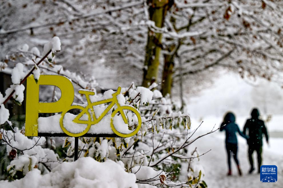 1月12日,在北马其顿首都斯科普里的城市公园,人们欣赏雪景。