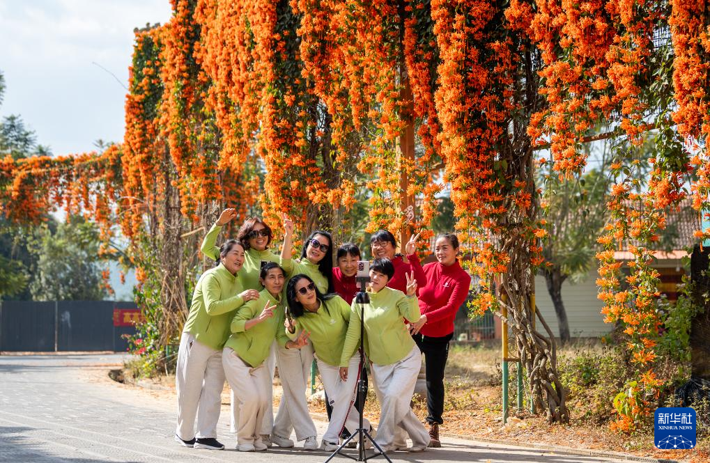 1月7日,在德宏傣族景颇族自治州陇川县陇把镇龙安村,盛开的炮仗藤花吸引游客拍照打卡。