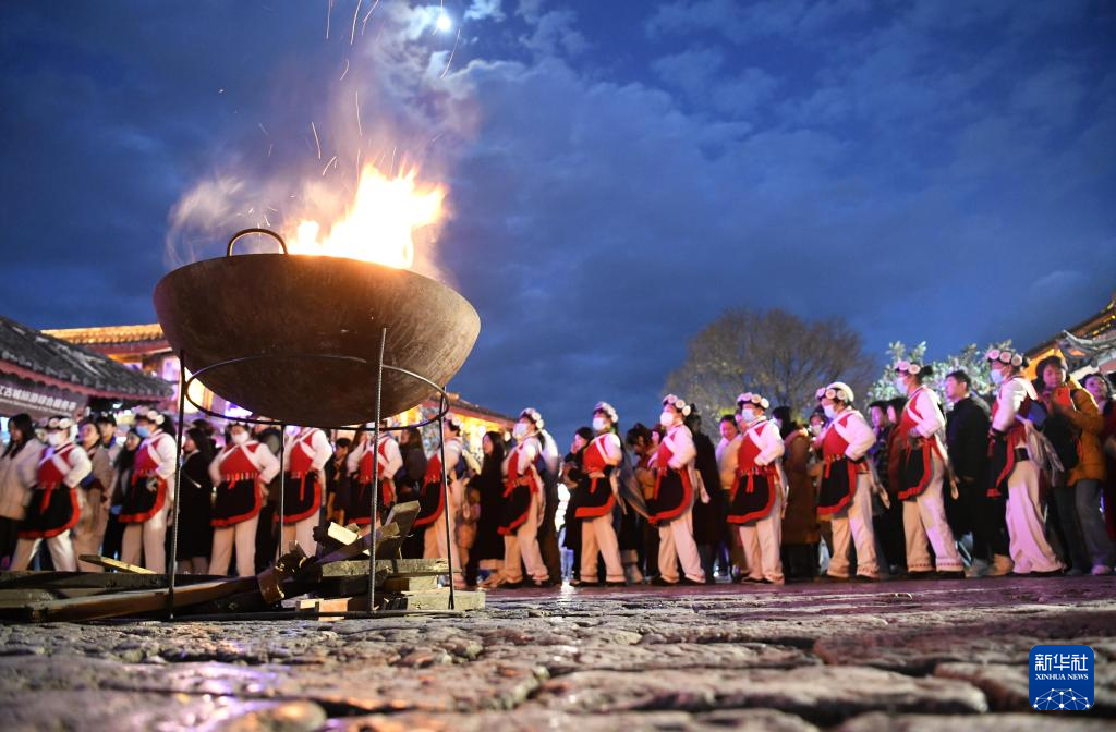 1月11日,游客和居民在丽江古城打跳游玩。