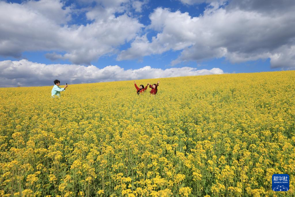 1月7日,在腾冲市明光镇凤凰村凤凰山油菜种植园中,盛开的油菜花吸引游客前来赏花游玩。