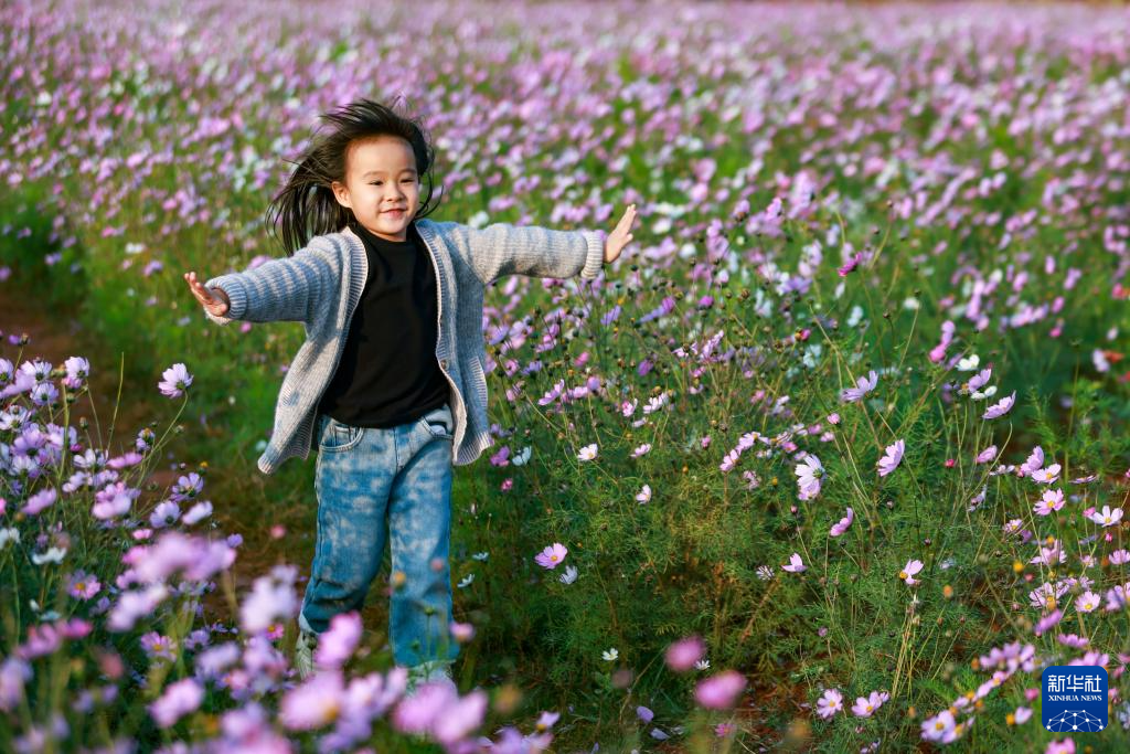 1月8日,在红河哈尼族彝族自治州开远市凤凰生态公园,小朋友在格桑花海里开心地奔跑。
