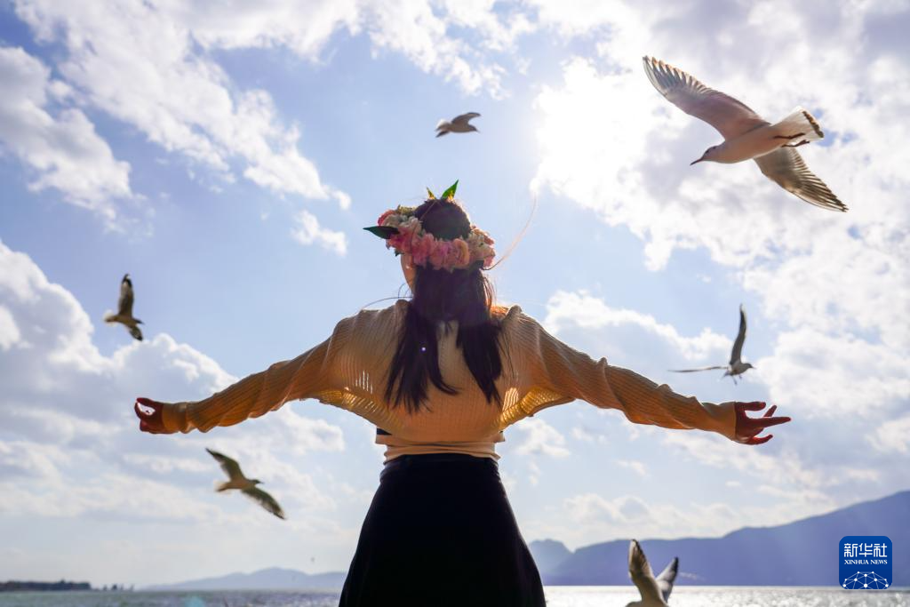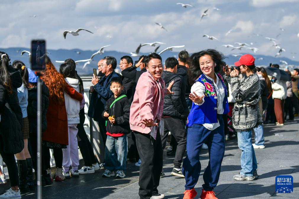 1月8日,游客在昆明市海埂大坝以红嘴鸥为背景拍摄舞蹈视频。