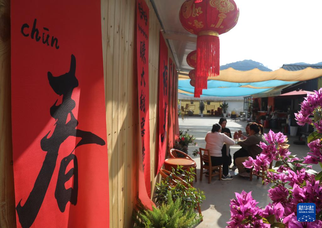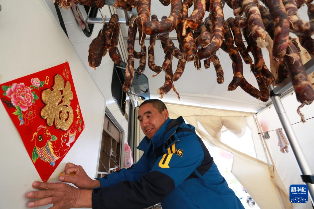 1月7日,在位于金沙江边的昭通市巧家县栗喉蜂虎房车营地,旅居游客在房车上贴福字迎新春。