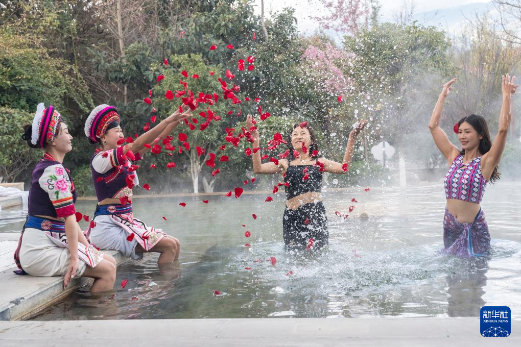 1月8日,游客在大理白族自治州洱源县的大理地热国景区体验温泉,感受温暖冬日。