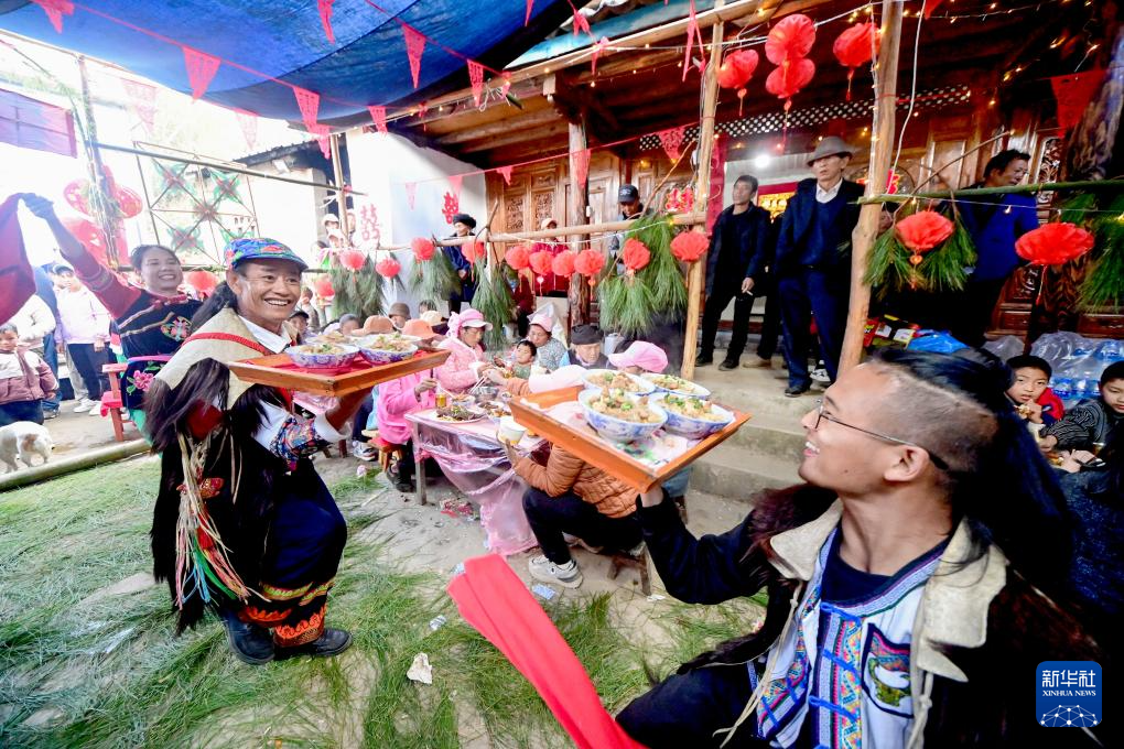 1月10日,在大理白族自治州南涧彝族自治县小湾东镇龙街村,工作人员给客人表演跳菜。