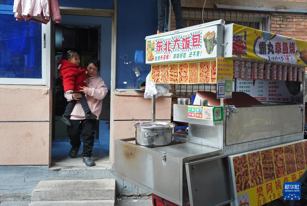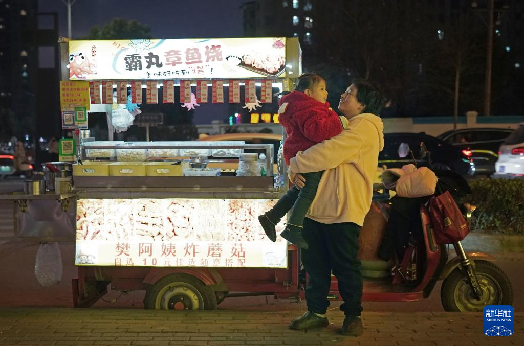忙碌间隙,樊检检在小吃摊前与女儿玩耍(1月7日摄)。