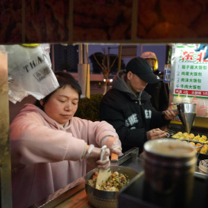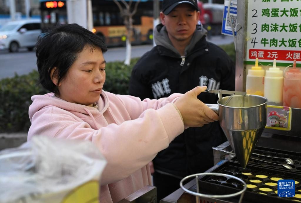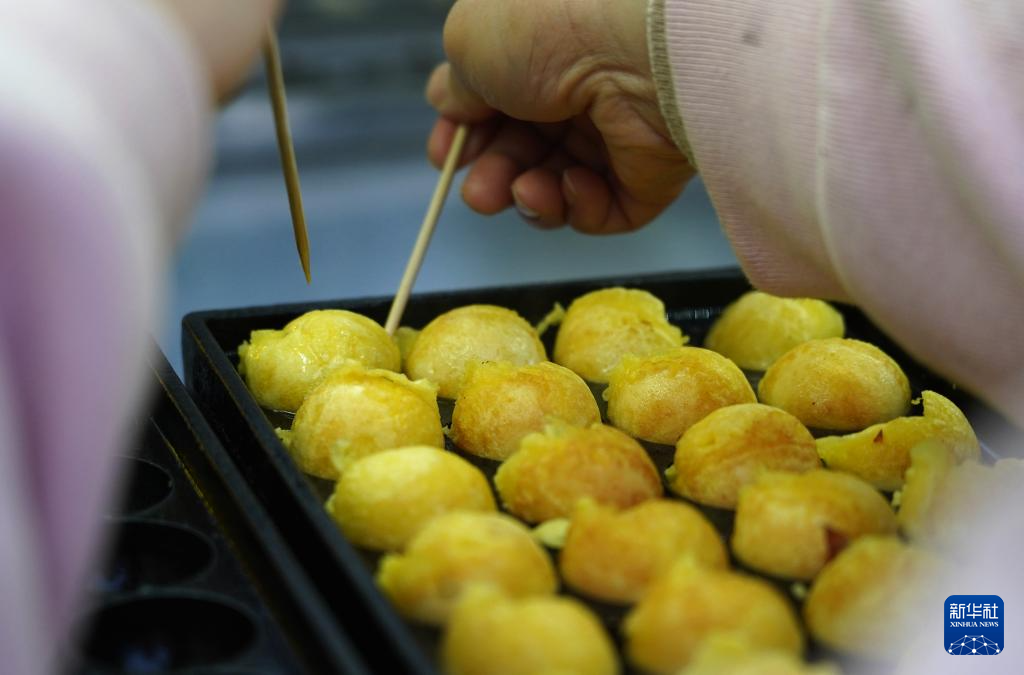 樊检检(左)在小吃摊制作小吃(1月7日摄)。