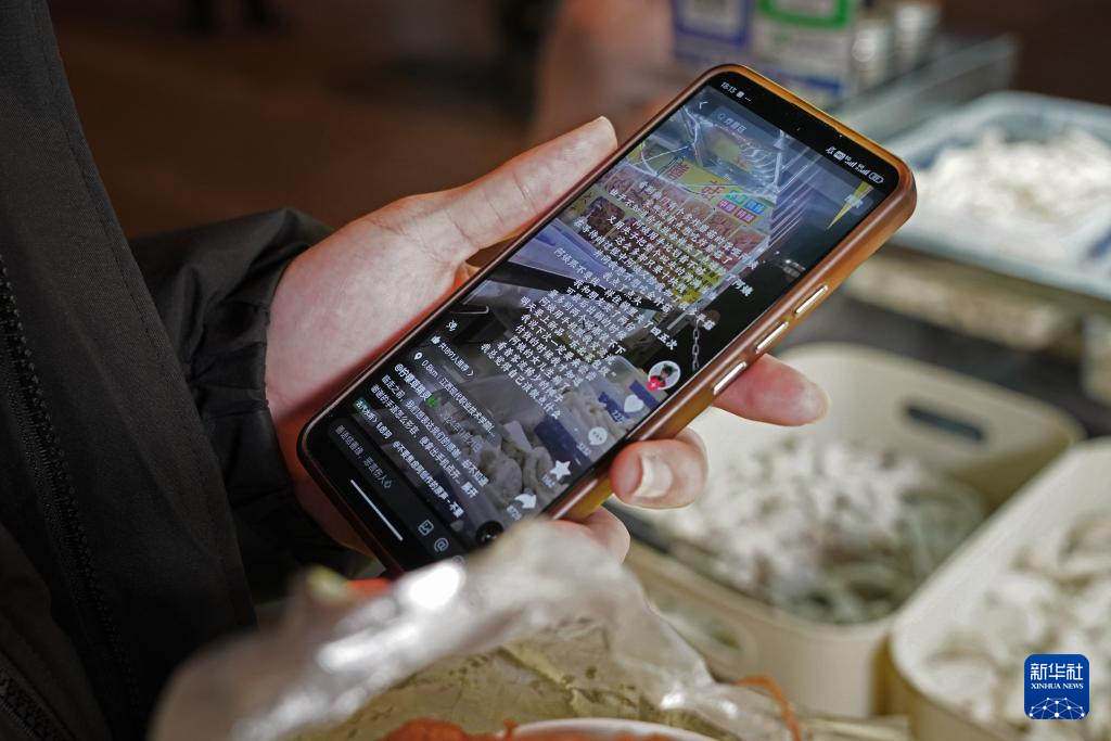 在小吃摊前,排队的顾客在观看江西现代职业技术学院学生胡婷发布的短视频(1月7日摄)。