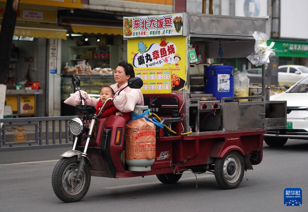 樊检检带着女儿骑车前往江西现代职业技术学院门口摆摊(1月7日摄)。