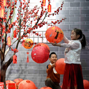 1月16日,小朋友在河北省群众艺术馆迎新春民俗文化展活动中悬挂灯笼。