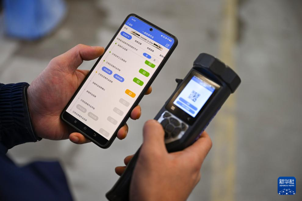1月16日,在上海动车段虹桥动车运用所,地勤机械师通过一级修数字化工位手持机了解当班作业任务。