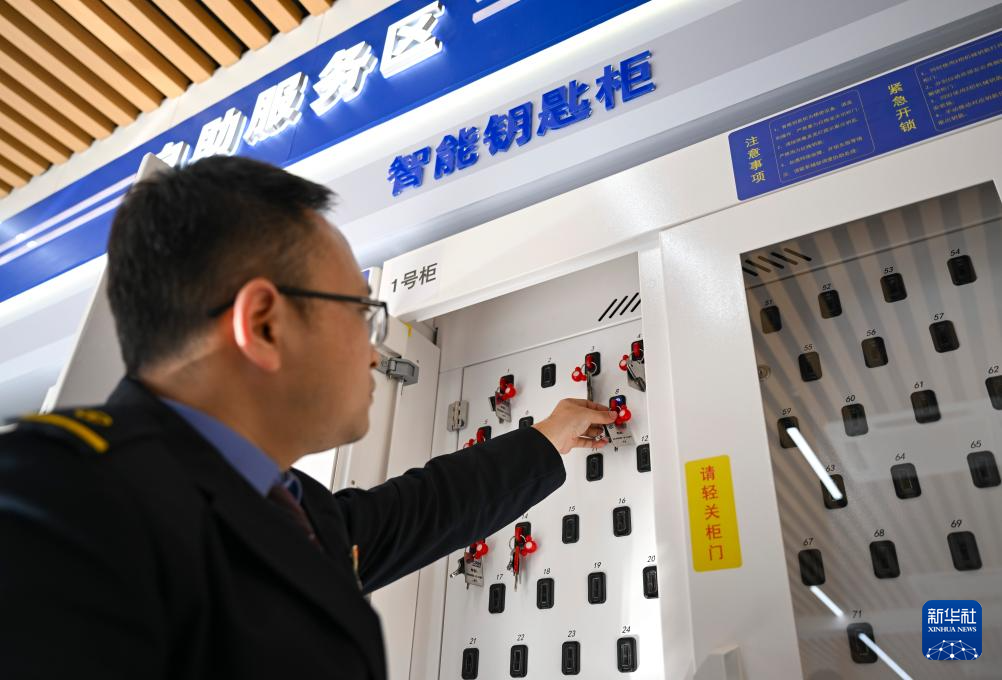 1月16日,在上海动车段虹桥动车运用所,调度员通过智能钥匙柜领用动车组钥匙。